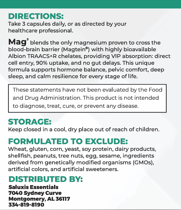 In the Saluxis Method, Mag3 primarily supports Replenish by restoring foundational mineral support and Reset by supporting calm resilience, deep sleep, hormone balance, and pelvic comfort. It may be especially helpful during times of stress, nervous system strain, muscle tension, or when more intentional magnesium support is needed for everyday balance.